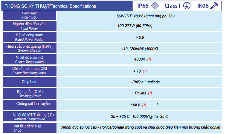 Ghi chú: Ký hiệu (*): Có thể thay đổi theo yêu cầu khách hàng Ký hiệu (**): Khách hàng có thể tham khảo bản vẽ chi tiết đèn tại website: http://www.vinshine.vn